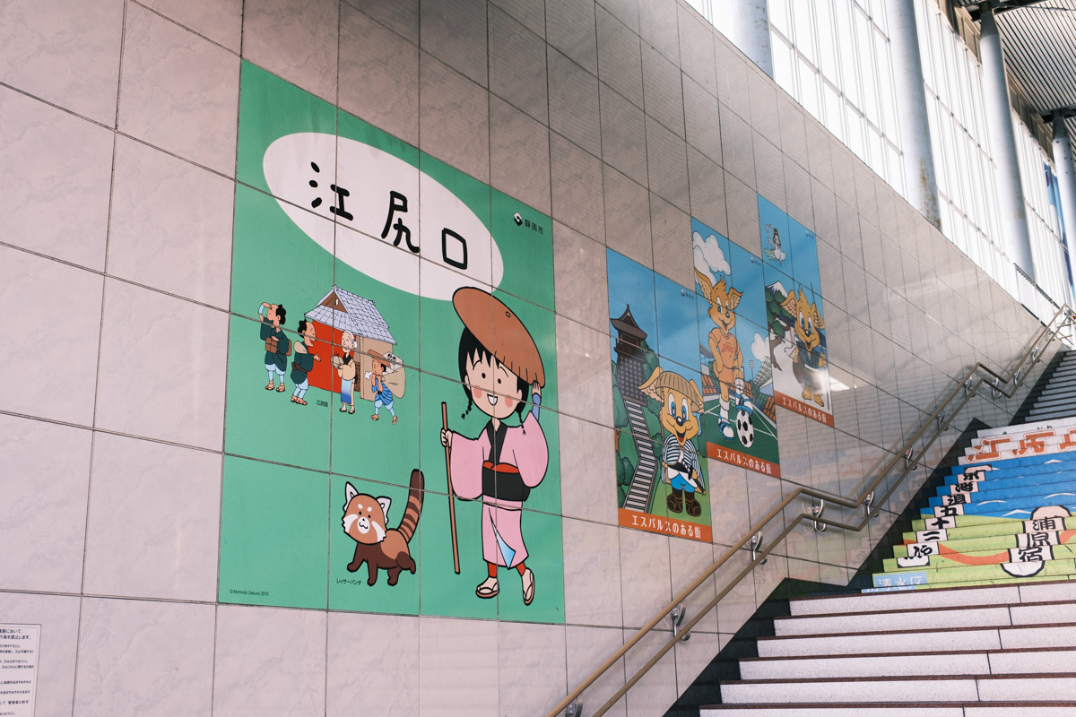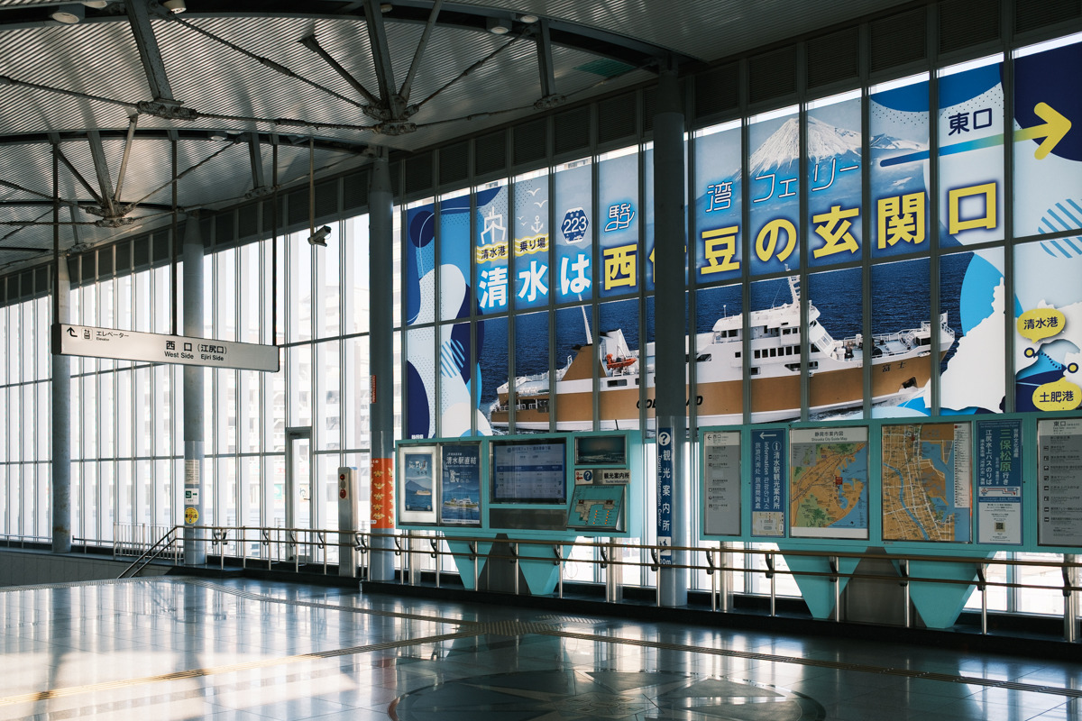 JR清水駅西口からスタート。改札を出ると駿河湾フェリーの案内が目に入り、海のまちを感じますが、今日は“街のほう”へ向かいます。壁画やマンホールのふたなど小さな被写体が点在し、天気の良い日は建物の間から富士山が見えることも。歩き出しから清水らしさを味わえます。