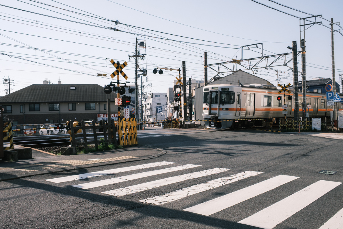 ボンヌールを出たら、次は巴川方面へ向かいます。光がきれいに差し込む路地もあり、歩くだけでもシャッターを切りたくなる場面が点在。波止場踏切を目印に、静鉄の新清水駅方面へまっすぐ進むイメージで歩くと、その先で巴川沿いへスムーズにつながります。