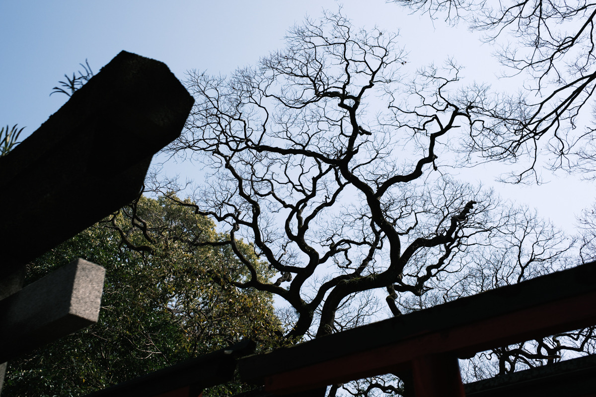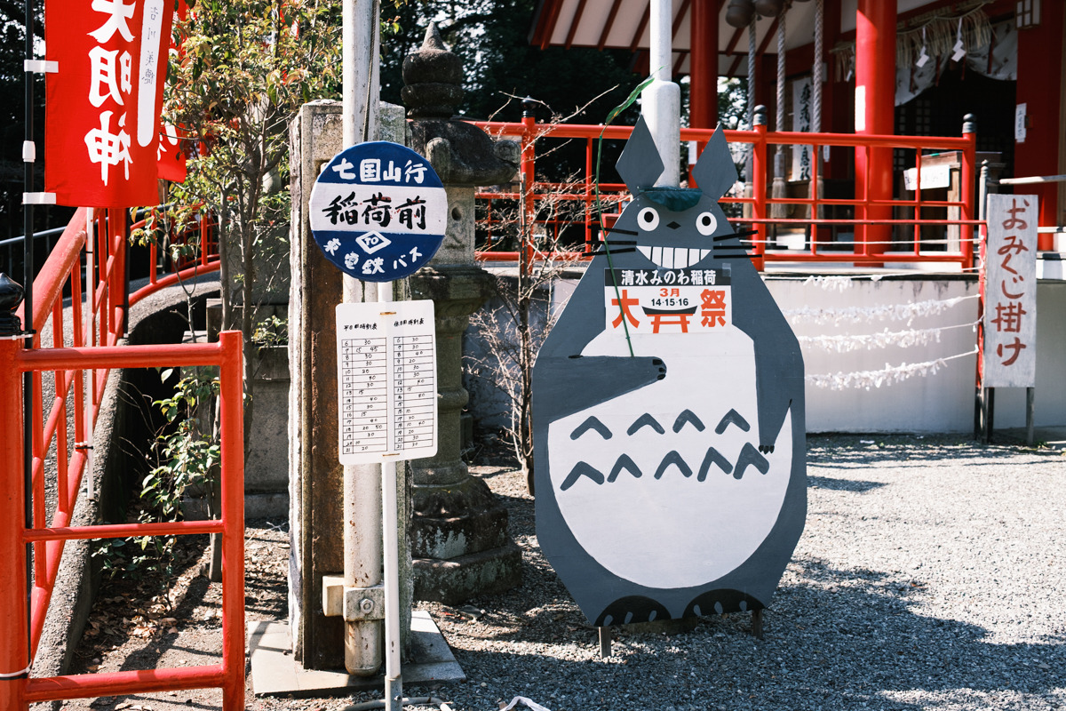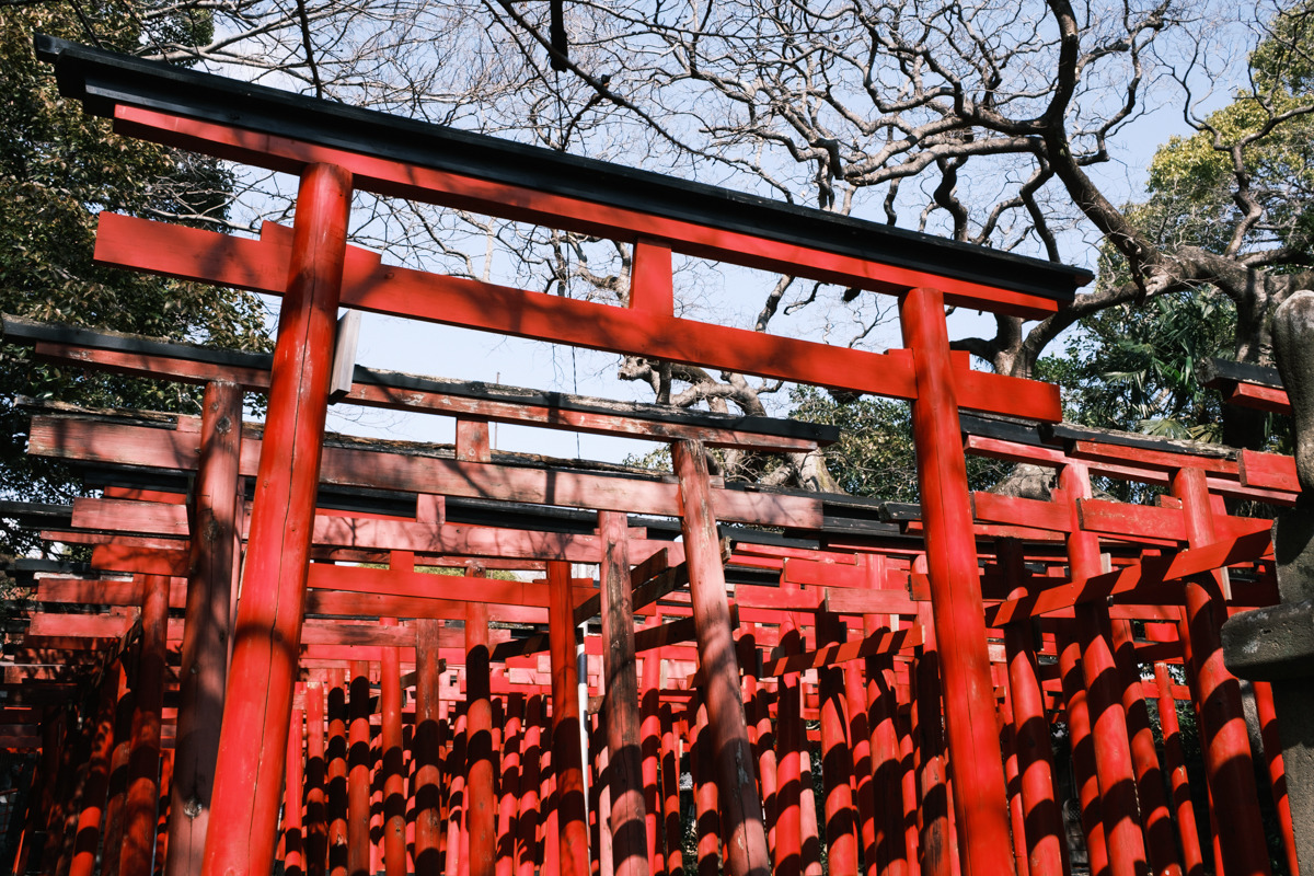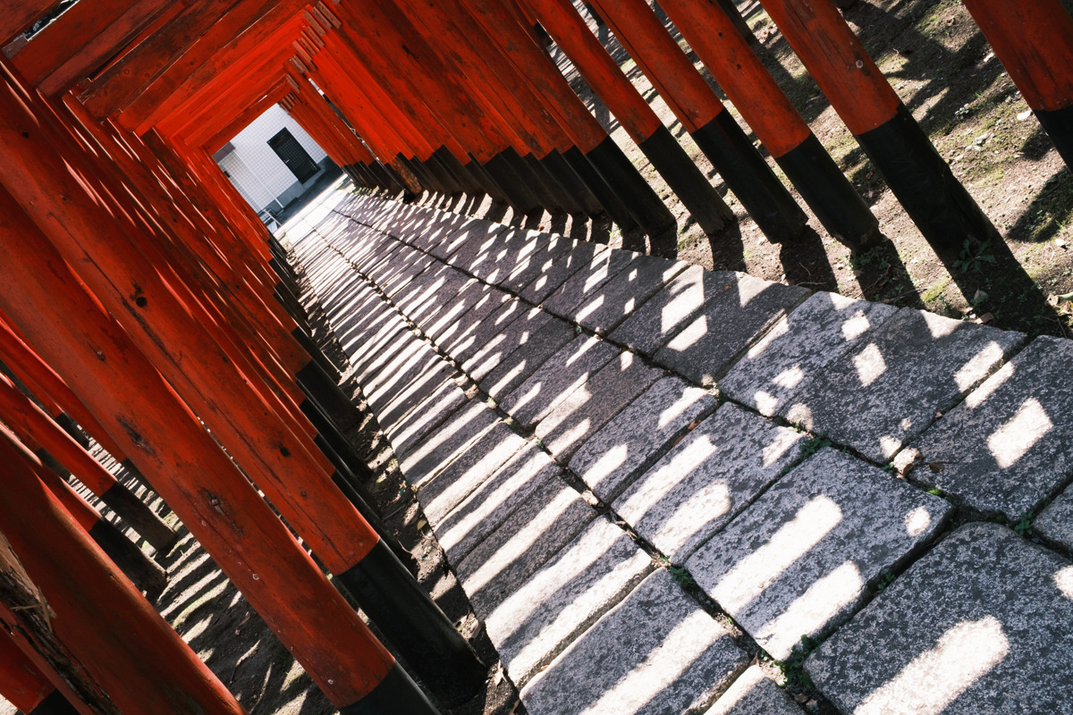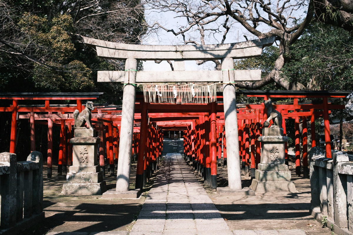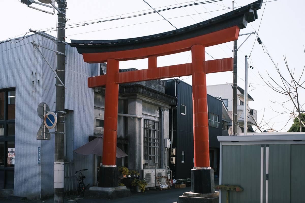 港橋周辺から少し歩いて、次郎長通りにある美濃輪稲荷神社へ寄り道します。境内に入ると、連なる赤鳥居が圧巻。街歩きの途中で空気がふっと変わり、写真の気分転換にもぴったりです。正面から参道の奥へ視線を通す構図はもちろん、少し角度を変えると鳥居の重なりが強調され、印象が変わります。