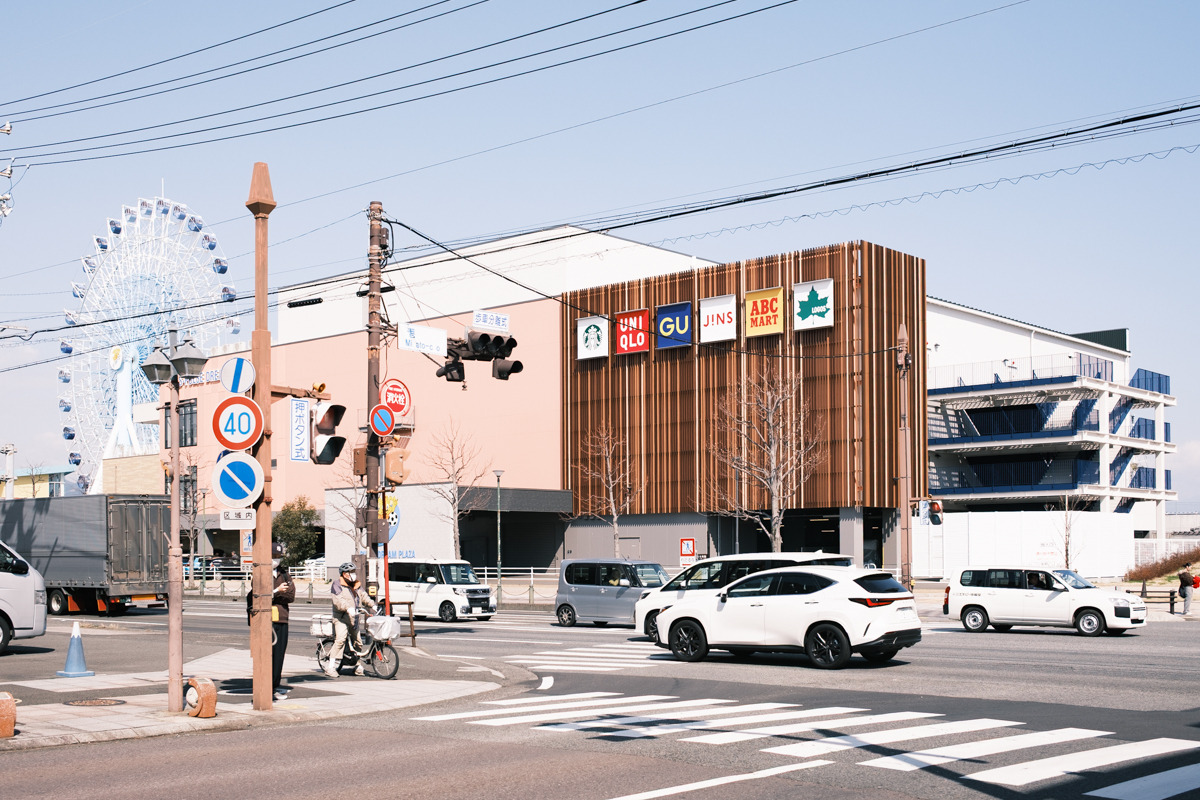 港橋から来た道を戻り、エスパルス通りへ。途中に「末廣」の黒い外観が現れて、港町らしい空気がふっと濃くなります。歩みを進めるほど視界が開け、観覧車が目印のエスパルスドリームプラザが見えてきます。