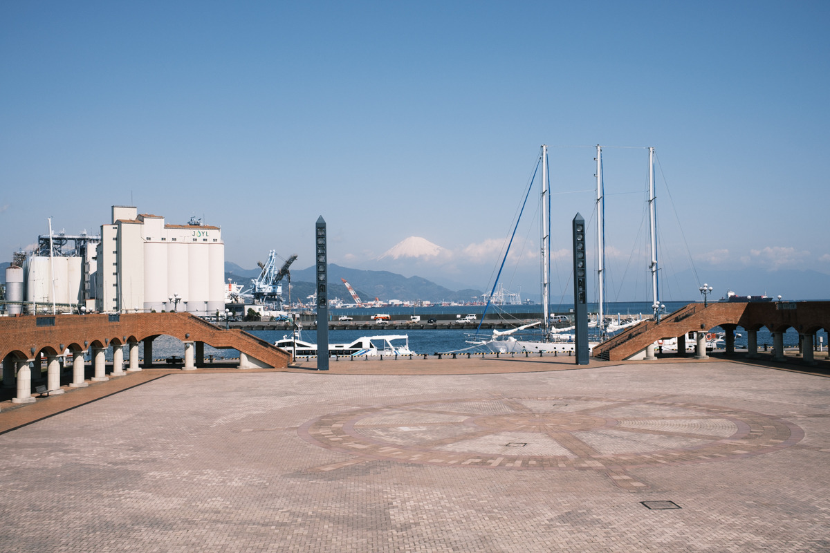 最後は、日の出埠頭周辺のエスパルスドリームプラザ、マリンパークへ。買い物や食事でひと息つけて、海辺の景色も楽しめるエリアです。水上バスや港内クルーズに乗れば、清水港の景色を海の上から味わえます。観覧車や水辺のカーブ、レンガの回廊など撮りどころも豊富。晴れた日は、広場の先に富士山が見えることもあります。