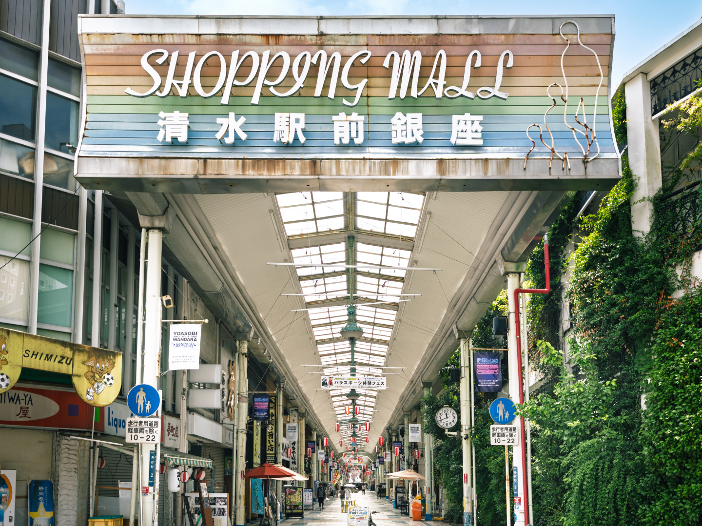 清水駅前銀座商店街は、JR清水駅西口から南北に続く、歴史ある地元の暮らしが息づくアーケード商店街です。