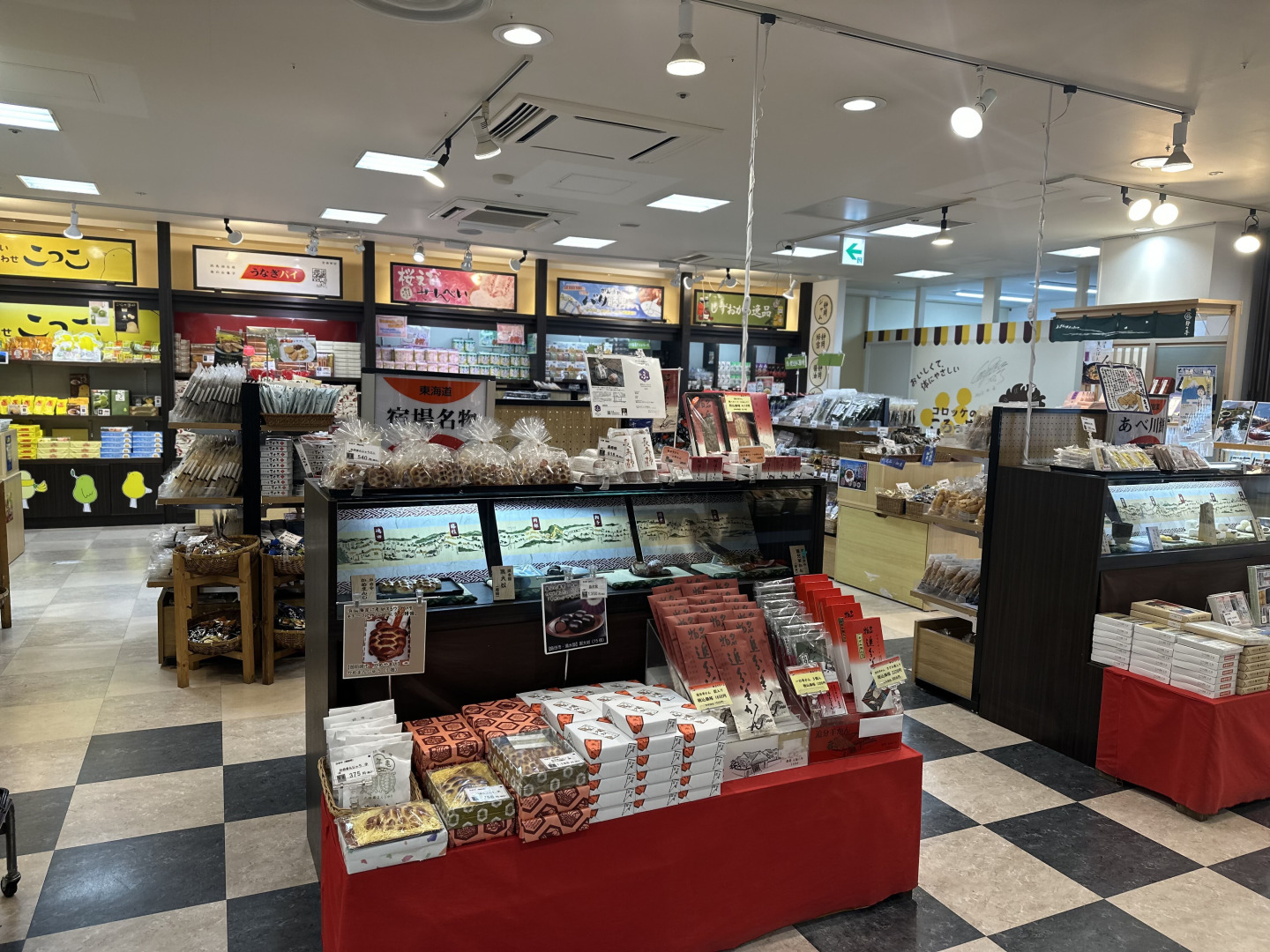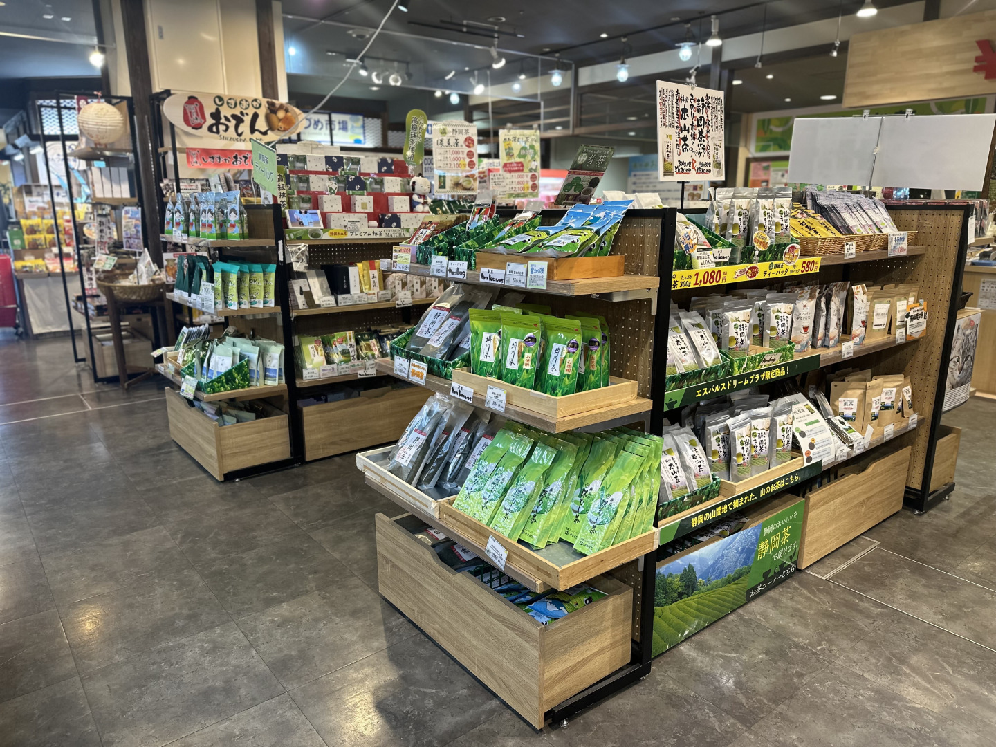 「駿河みやげ横丁」では、県内各地の定番銘菓が揃い、静岡のお茶や特産品も豊富に取り扱っています。また「駿河みのり市場」では、静岡の地場食品を取り扱っており、いちごやみかんなど、生産者のこだわりが詰まった食材も並びます。