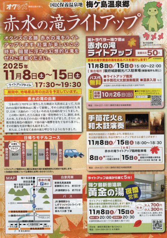 11月8日(土)と15日(土)に手筒花火が披露され、15日(土)は和太鼓演奏も行われます。また、赤水の滝から車で5分の距離にある梅ヶ島新田温泉「黄金の湯」では両日、特別に夜間営業をしています。