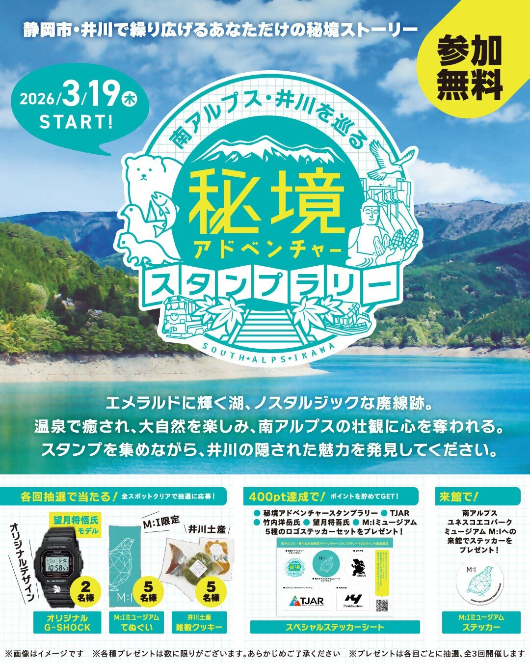 南アルプスユネスコエコパークミュージアムを起点に、各スポットを巡りながらクイズや写真撮影などのミッションでスタンプを獲得し、オリジナル“G-SHOCK”などの豪華景品をGETしよう!