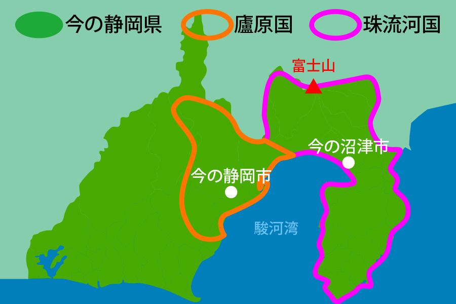 現在の静岡県中部・東部は、「廬原国(いおはらのくに)」と「珠流河国(するがのくに)」と呼ばれていた。このころ、今の静岡市は廬原国で、珠流河国は廬原国の東隣。