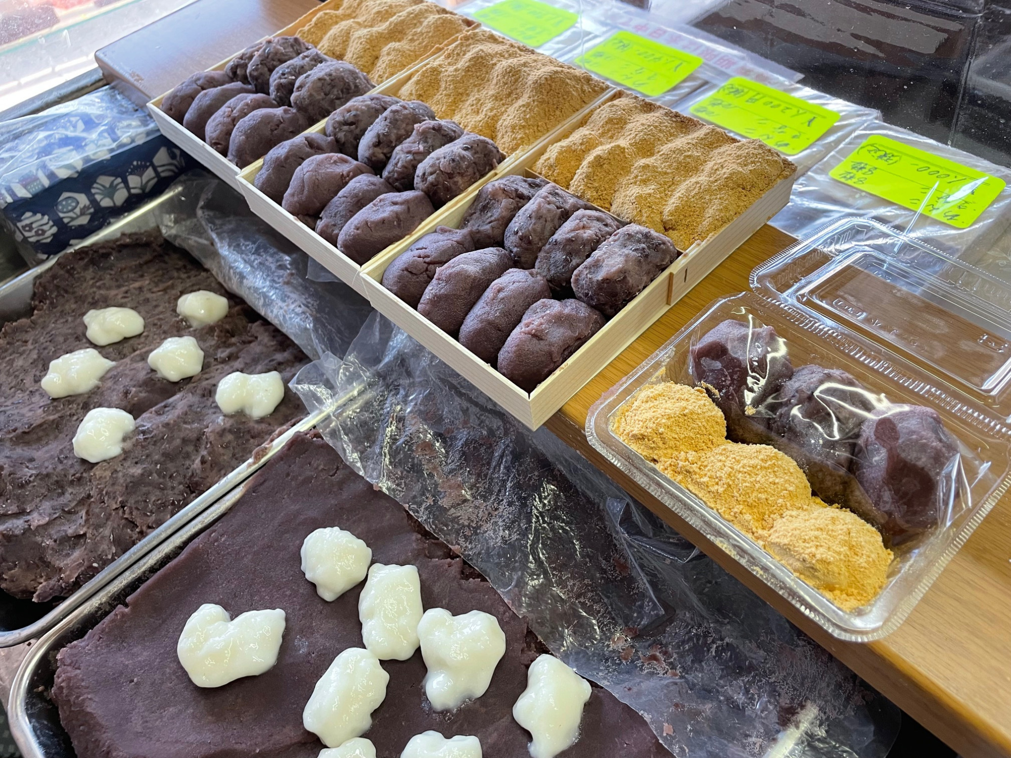 - 会社勤めの店主が日曜日にだけ開く小さな名店。きなこ・こしあん・粒あんを自由に組み合わせられ、特に粒あんを使った安倍川もちは珍しい一品です。