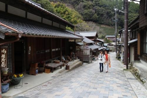 宇津ノ谷峠の手前には、静かな集落が江戸時代さながらの家並みを見せています。かつては旅人たちで大いに賑わっていました。家々の軒先に掲げた屋号の看板や石畳が往時の風情をしのばせています。
